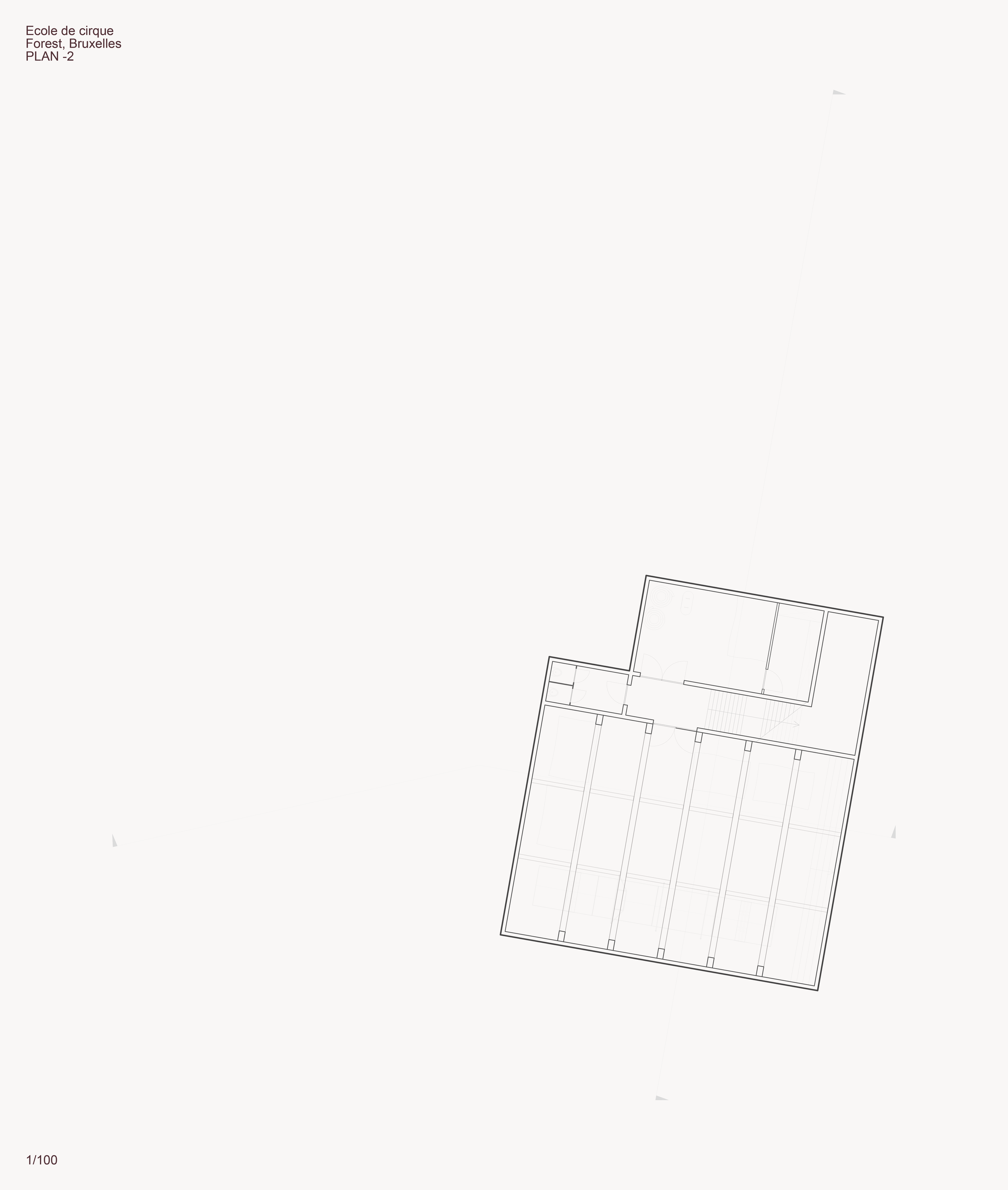 L'école de cirque s'implante sur une parcelle située entre le Wiels et le Brass, à Forest. Le programme imposé engage une réflexion sur l'organisation spatiale et la circulation entre les différents espaces nécessaires : salles d'entraînement, salles de cours, bureaux, cafétéria, vestiaires, espaces techniques et de rangement. La topographie du site, marquée par une pente, génère une différence de hauteur entre le trottoir et la parcelle, tandis que l'extrémité du terrain s'ouvre vers le chemin longeant le Marais Wiels.